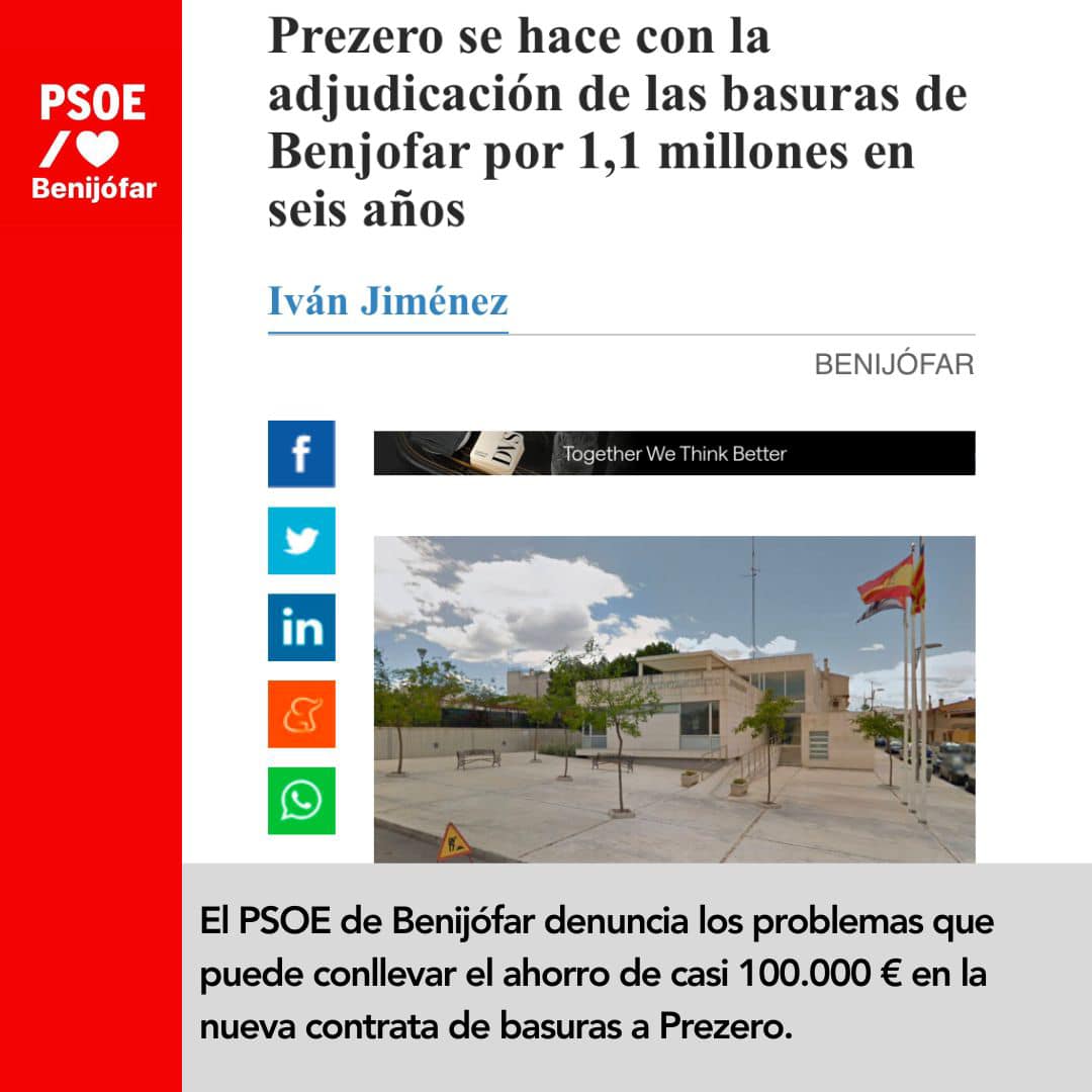 El Grupo Municipal Socialista en el Ayuntamiento de Benijófar estará vigilante para asegurar que este contrato se ejecute adecuadamente. En caso de detectar posibles incumplimientos del pliego de condiciones o problemas en la ejecución del contrato que puedan afectar a los vecinos y vecinas, lo denunciaremos y los llevaremos al Pleno del Ayuntamiento para tratar este tema como se deben.