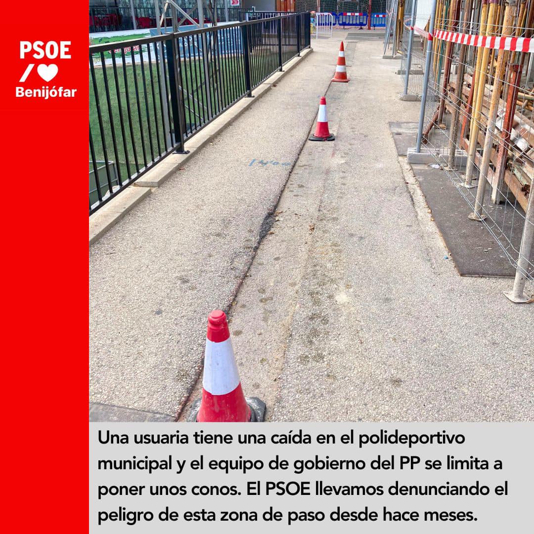 Hoy mismo, una usuaria del Polideportivo Municipal ha sufrido una caída en la zona de entrada a las instalaciones. La “solución” adoptada por el actual equipo de gobierno del PP en el Ayuntamiento, tras la caída, ha sido colocar unos conos para señalizar el peligro. Esta zona de paso, que transcurre entre las obras del nuevo edificio polivalente, tiene una zanja longitudinal en el pavimento y que no está señalizada, suponiendo un constante peligro para las personas usuarias.